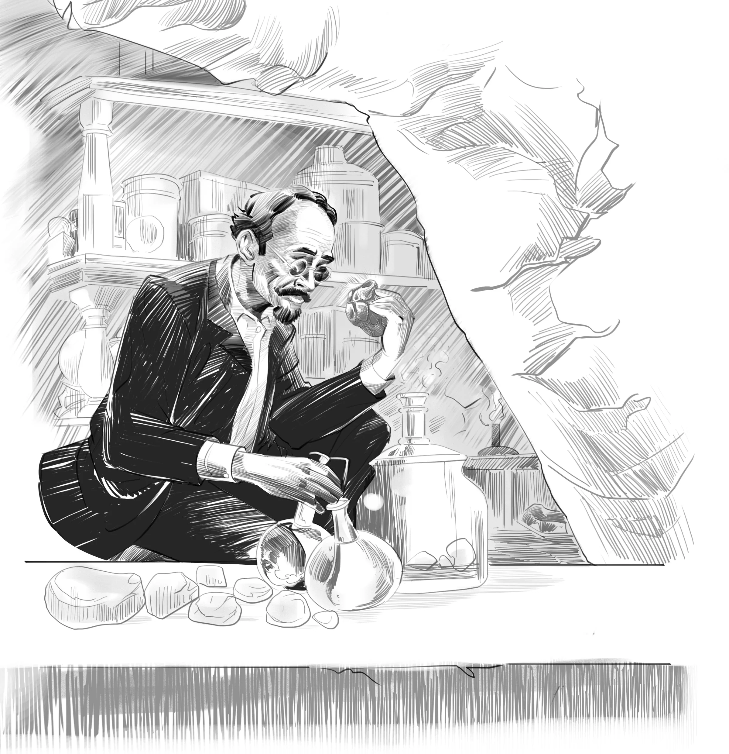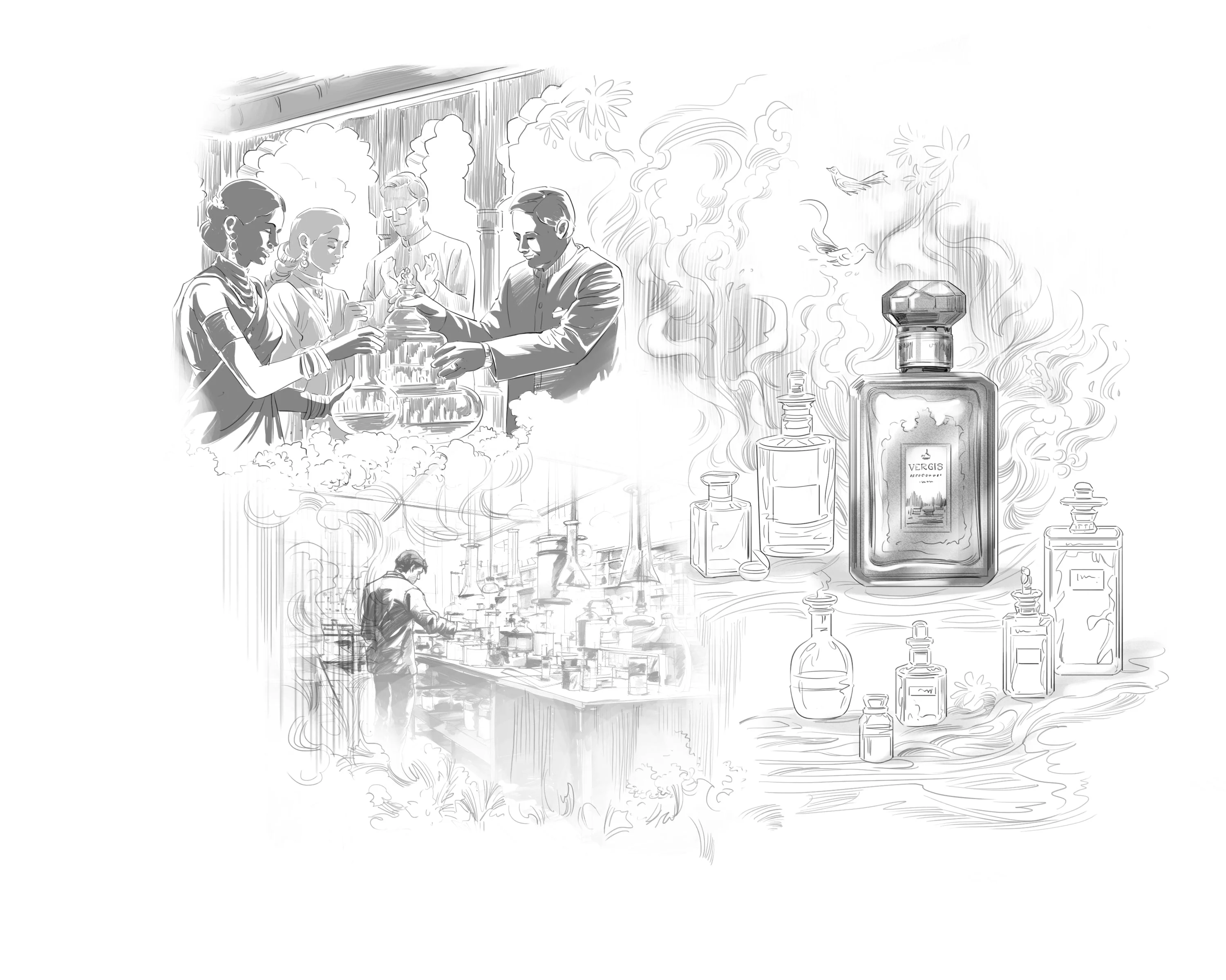 emerald-cut bottle of a precious fragrance concentrate—Vergis. Enchanted by his innate skills in